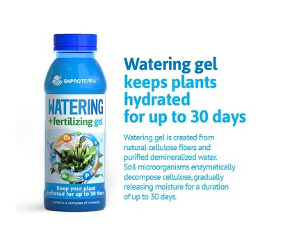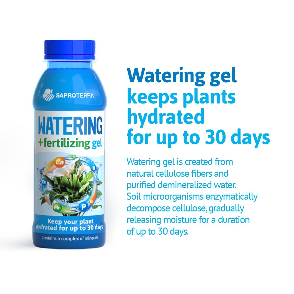 Watering gel is created from natural cellulose fibers and purified demineralized water. Soil microorganisms enzymatically decompose cellulose, gradually releasing moisture for a duration of up to 30 days.